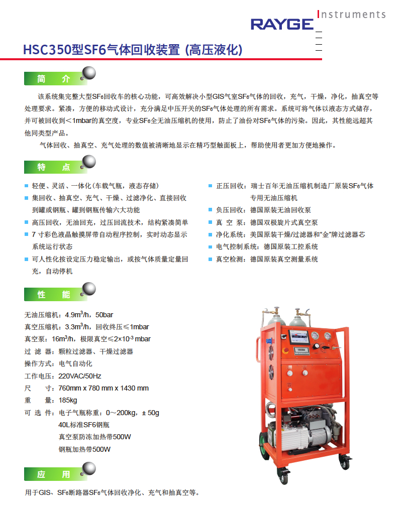 該系統(tǒng)集完整大型SF6回收車的核心功能,可高效解決小型GIS氣室SF6氣體的回收,充氣,干燥,凈化,抽真空等處理要求。緊湊,方便的移動式設(shè)計,充分滿足中壓開關(guān)的SF6氣體處理的所有需求。系統(tǒng)可將氣體以液態(tài)方式儲存,并可被回收到<1mbar的真空度,專業(yè)SF6全無油壓縮機的使用,防止了油份對SF6氣體的污染。因此,其性能遠超其他同類型產(chǎn)品。