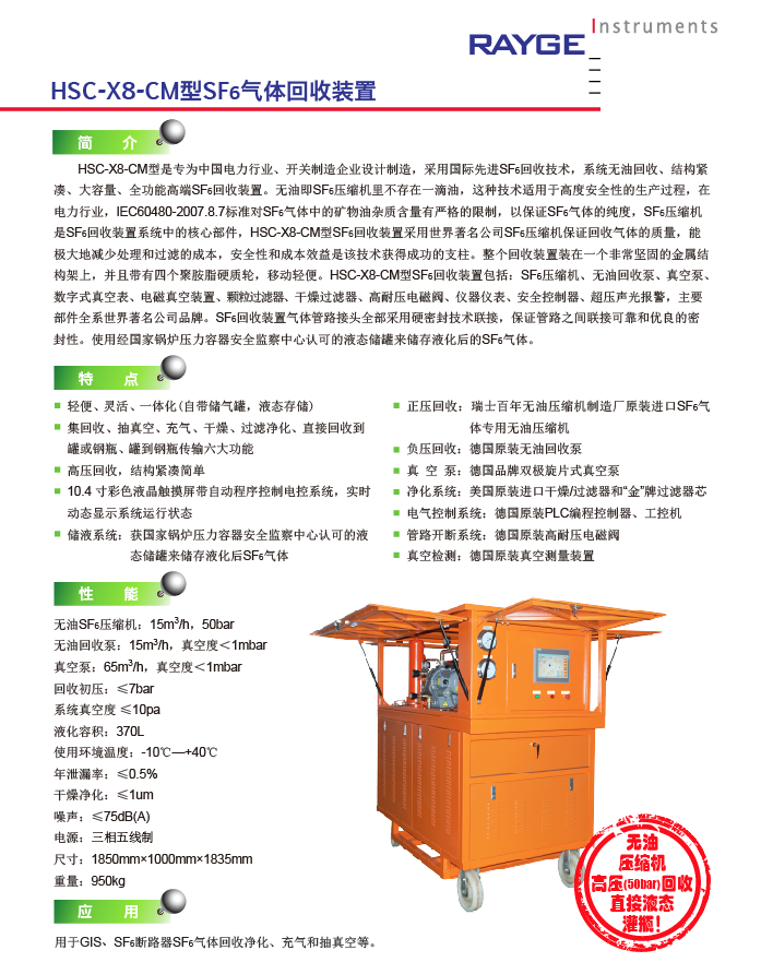 HSC-X8-CM型是專為中國電力行業(yè)、開關(guān)制造企業(yè)設(shè)計制造,采用國際先進SF6回收技術(shù),系統(tǒng)無油回收、結(jié)構(gòu)緊湊、大容量、全功能高端SF6回收裝置。