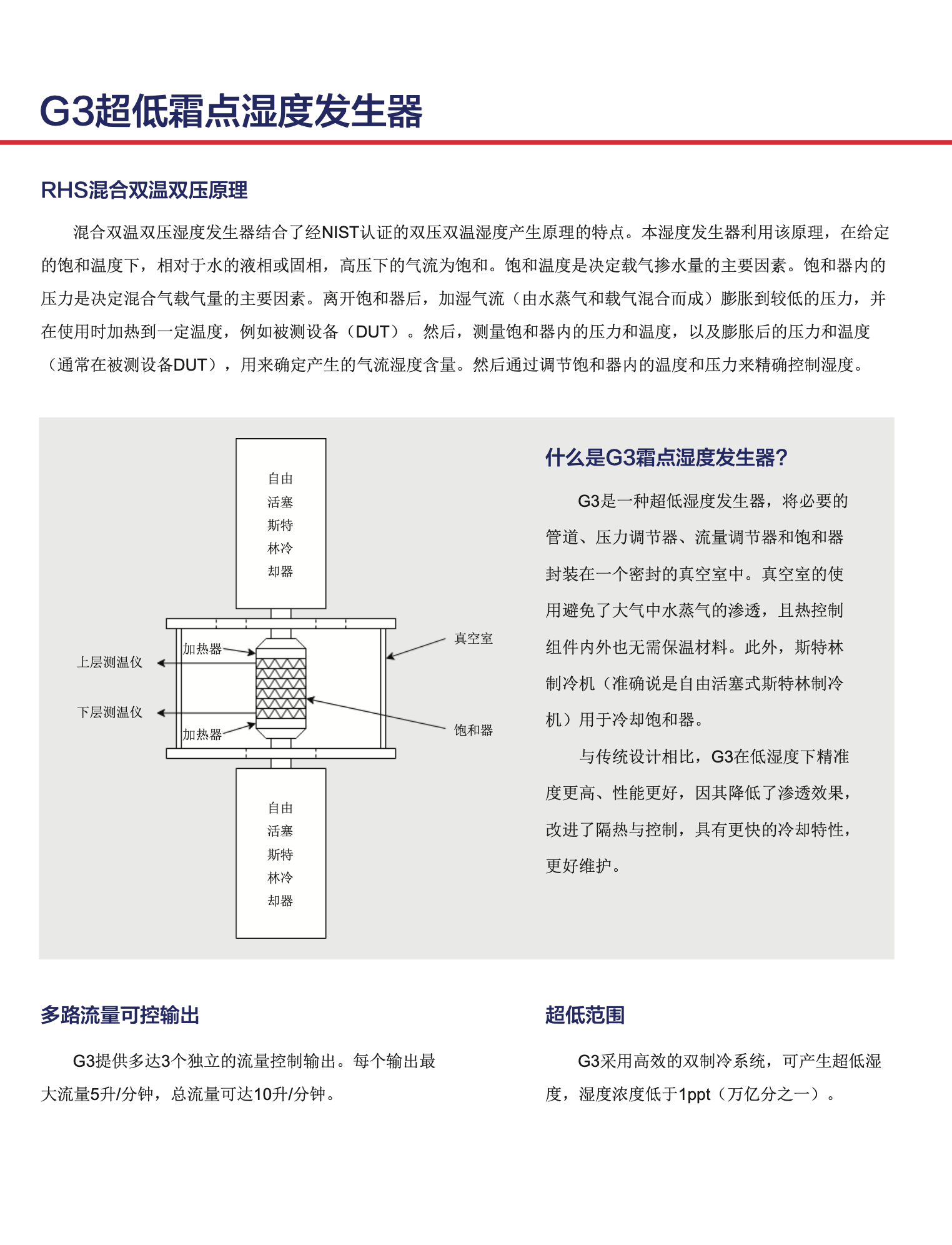 混合雙溫雙壓濕度發(fā)生器結(jié)合了經(jīng)NIST認(rèn)證的雙壓雙溫濕度產(chǎn)生原理的特點(diǎn)。本濕度發(fā)生器利用該原理,在給定的飽和溫度下,相對(duì)于水的液相或固相,高壓下的氣流為飽和。飽和溫度是決定載氣摻水量的主要因素。飽和器內(nèi)的壓力是決定混合氣載氣量的主要因素。離開飽和器后,加濕氣流(由水蒸氣和載氣混合而成)膨脹到較低的壓力,并在使用時(shí)加熱到一定溫度,例如被測設(shè)備(DUT)。然后,測量飽和器內(nèi)的壓力和溫度,以及膨脹后的壓力和溫度(通常在被測設(shè)備DUT),用來確定產(chǎn)生的氣流濕度含量。然后通過調(diào)節(jié)飽和器內(nèi)的溫度和壓力來精確控制濕度。