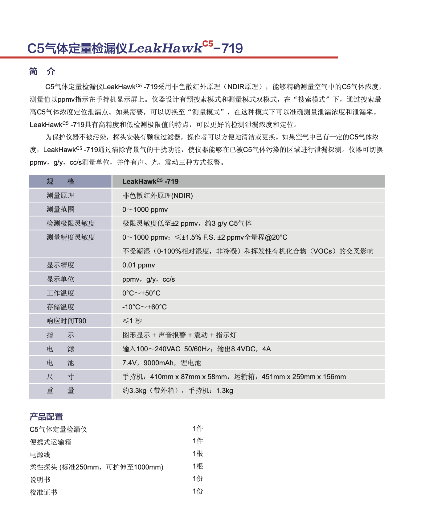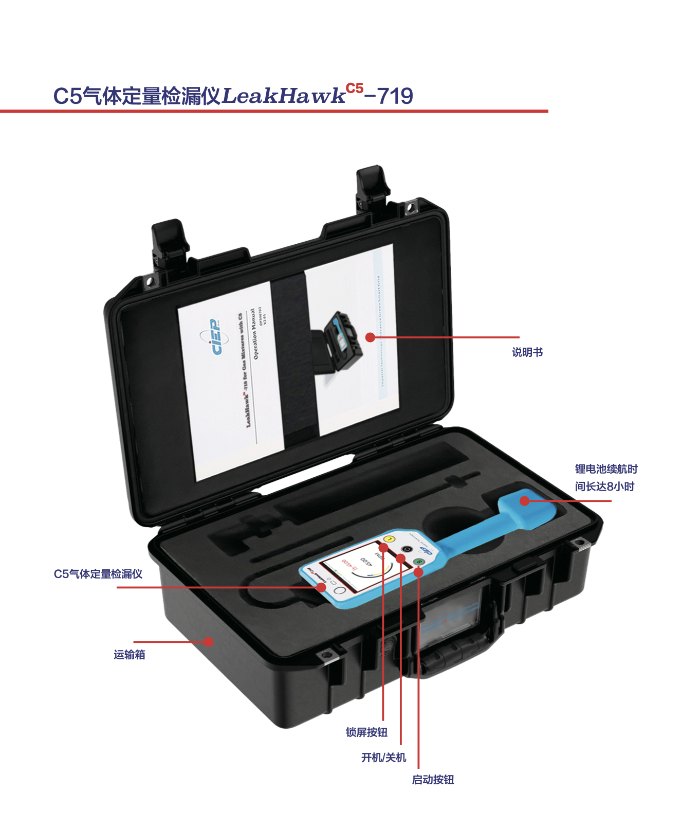 采用非色散紅外原理(NDIR原理),能夠精確測量空氣中的C5氣體濃度,測量值以ppmv指示在手持機顯示屏上。儀器設計有預搜索模式和測量模式雙模式,在“搜索模式”下,通過搜索最高C5氣體濃度定位泄漏點。