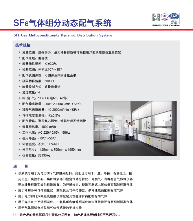 MDD-SF6型SF6 氣體組分動(dòng)態(tài)配氣系統(tǒng)是一款環(huán)保型設(shè)備,集自動(dòng)配氣、儀表標(biāo)定、儀表校準(zhǔn)及校驗(yàn)等功能于一體。該系統(tǒng)采用德國原廠設(shè)計(jì)并授權(quán)生產(chǎn)的系統(tǒng)化、封閉式結(jié)構(gòu),全新雙對角側(cè)壁排風(fēng)設(shè)計(jì)、組合式安裝技術(shù),將自動(dòng)配氣標(biāo)定裝置、待檢測校驗(yàn)的儀表工作臺和排風(fēng)系統(tǒng)等完美結(jié)合,獨(dú)立的抽風(fēng)系統(tǒng)符合歐洲實(shí)驗(yàn)室通風(fēng)柜測試標(biāo)準(zhǔn)。整機(jī)外形簡潔流暢、操作簡單,該設(shè)備的使用推廣,能夠?yàn)閺氖聝x器儀表校驗(yàn)、標(biāo)定的工作人員提供一個(gè)無污染、安全環(huán)保的工作環(huán)境,是實(shí)驗(yàn)室、計(jì)量儀器儀表檢測中心不可多得的校驗(yàn)設(shè)備。