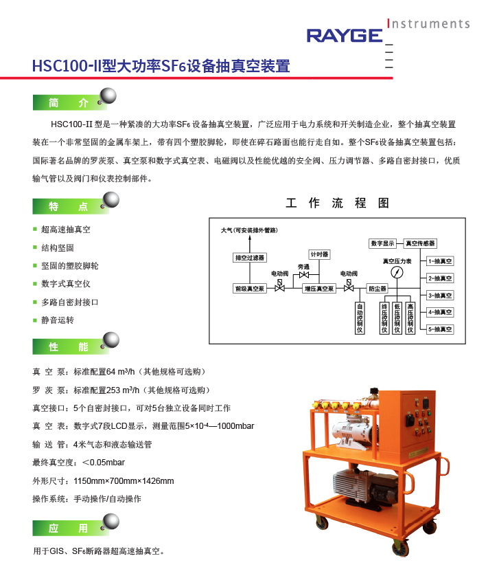 HSC100II型是一種緊湊的大功率SF6設(shè)備抽真空裝置,廣泛應(yīng)用于電力系統(tǒng)和開關(guān)制造企業(yè),整個抽真空裝置裝在一個非常堅固的金屬車架上,帶有四個塑膠腳輪,即使在碎石路面也能行走自如。整個SF6設(shè)備抽真空裝置包括:國際著名品牌的羅茨泵、真空泵和數(shù)字式真空表、電磁閥以及性能優(yōu)越的安全閥、壓力調(diào)節(jié)器、多路自密封接口,優(yōu)質(zhì)輸氣管以及閥門和儀表控制部件。