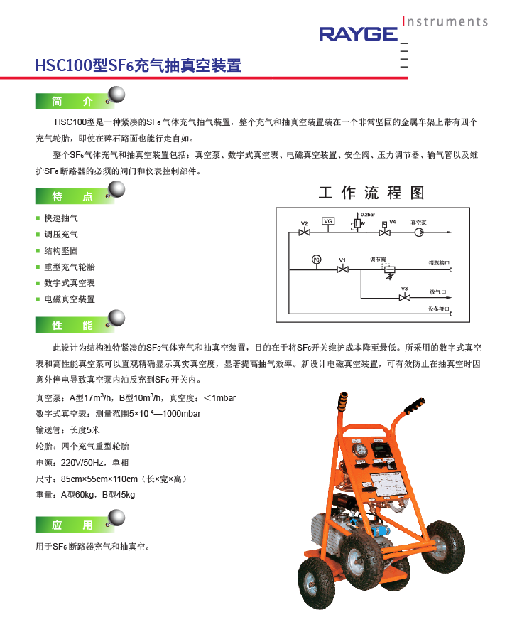 HSC100型是一種緊湊的SF6氣體充氣抽氣裝置,整個(gè)充氣和抽真空裝置裝在一個(gè)非常堅(jiān)固的金屬車(chē)架上帶有四個(gè)充氣輪胎,即使在碎石路面也能行走自如。