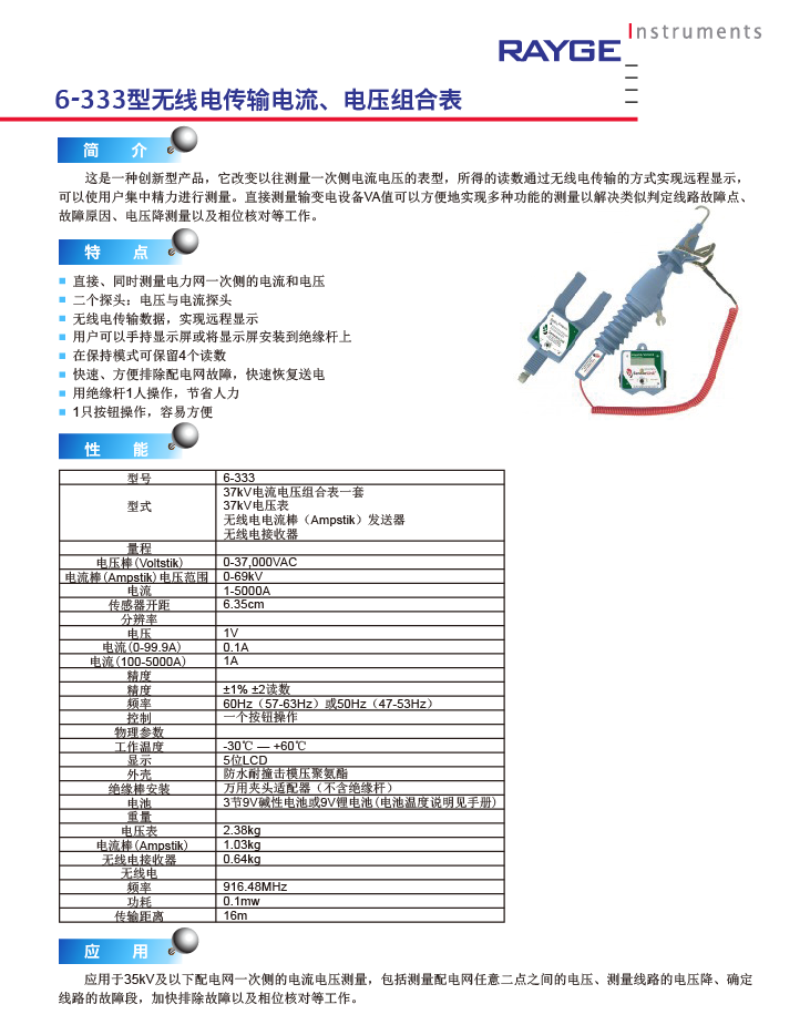 這是一種創(chuàng)新型產(chǎn)品,它改變以往測量一次側(cè)電流電壓的表型,所得的讀數(shù)通過無線電傳輸?shù)姆绞綄?shí)現(xiàn)遠(yuǎn)程顯示,可以使用戶集中精力進(jìn)行測量。直接測量輸變電設(shè)備VA值可以方便地實(shí)現(xiàn)多種功能的測量以解決類似判定線路故障點(diǎn)、故障原因、電壓降測量以及相位核對等工作。