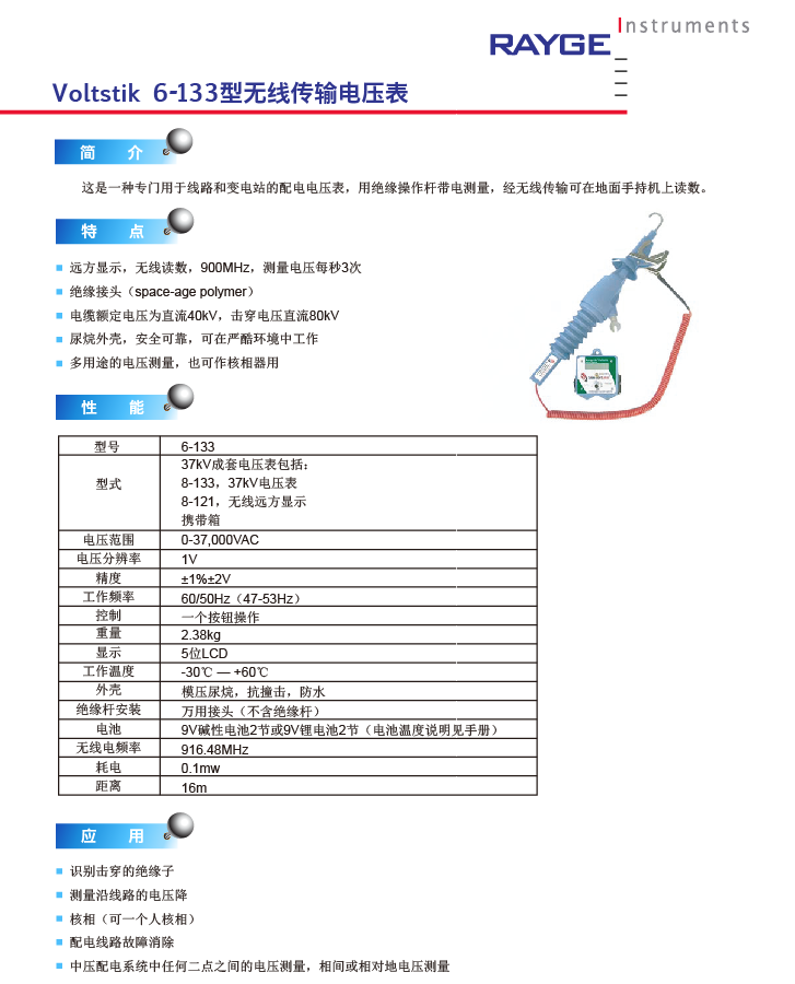 這是一種專門用于線路和變電站的配電電壓表,用絕緣操作桿帶電測(cè)量,經(jīng)無(wú)線傳輸可在地面手持機(jī)上讀數(shù)。