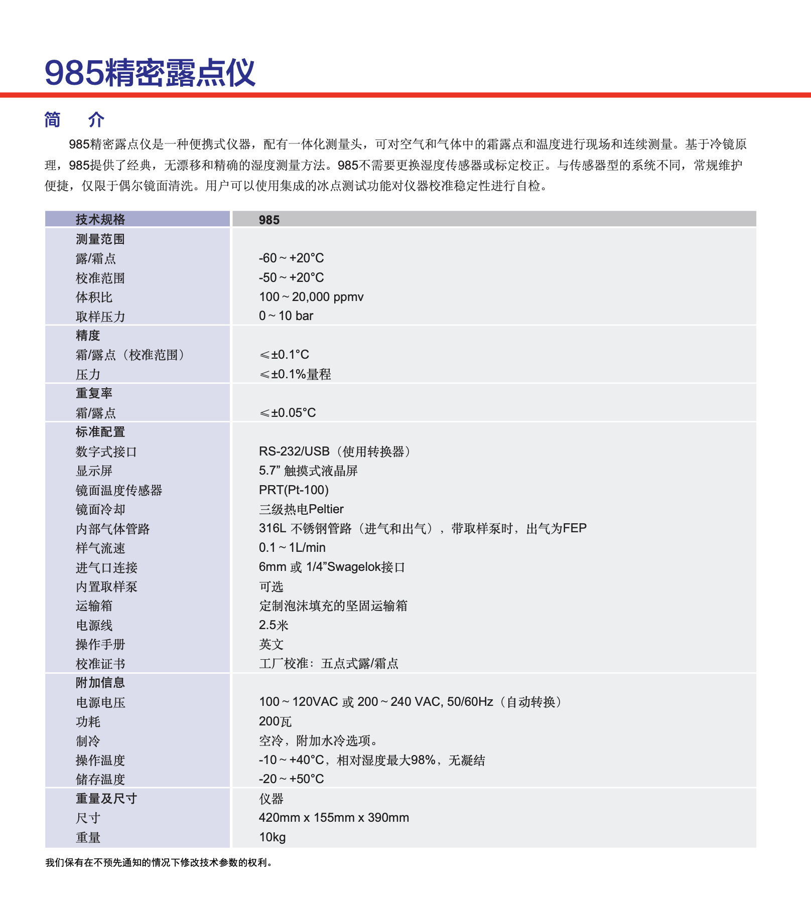 985精密露點儀是一種便攜式儀器,配有一體化測量頭,可對空氣和氣體中的霜露點和溫度進行現(xiàn)場和連續(xù)測量?;诶溏R原理,985提供了經(jīng)典,無漂移和精確的濕度測量方法。