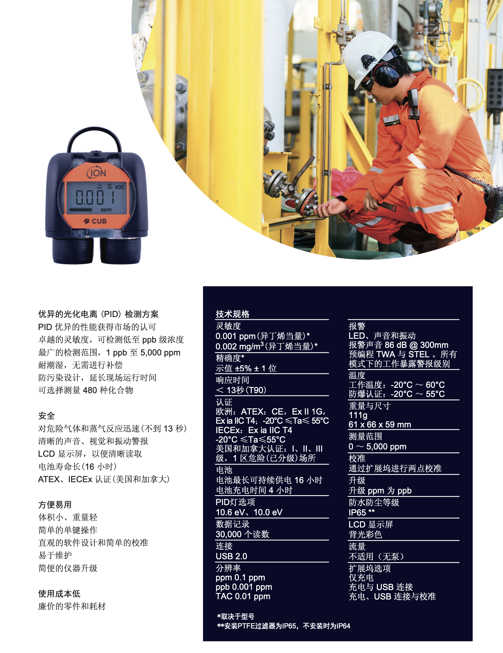 CUB 是佩戴式的人身安全PID監(jiān)測儀,用于準(zhǔn)確檢測揮發(fā)性有機(jī)化合物和芳香族化合物。憑借十億分之一(ppb)靈敏度,CUB 可在危險(xiǎn)氣體 (包括苯)尚未達(dá)到有害濃度時(shí)提前發(fā)出警告。